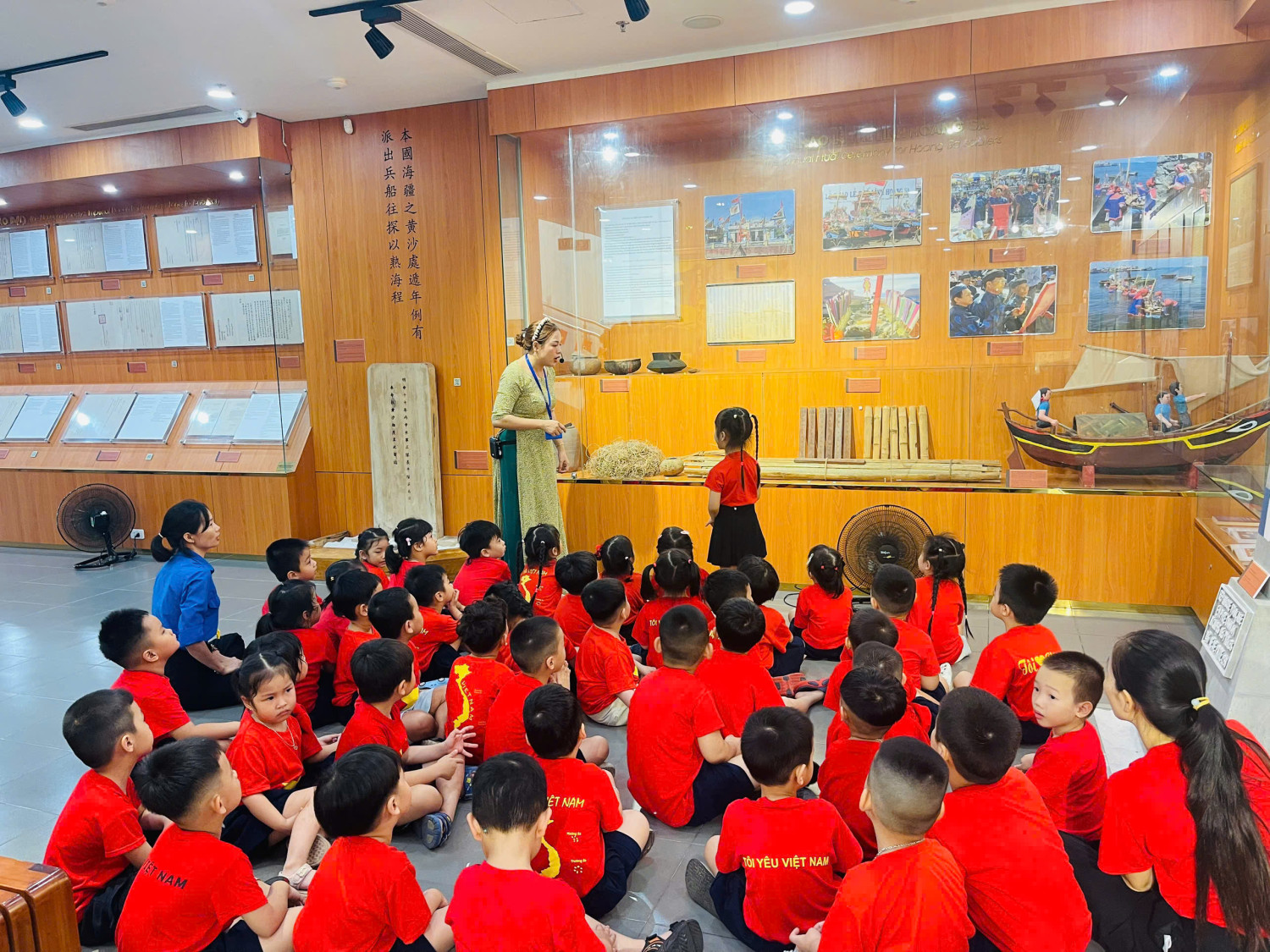 Tại đây, các bé được tham quan không gian trưng bày với nhiều hình ảnh, tư liệu, hiện vật sinh động về quần đảo Hoàng Sa – một phần lãnh thổ thiêng liêng của Việt Nam. Thông qua sự hướng dẫn tận tình của các cô hướng dẫn viên, các bé được nghe kể chuyện, quan sát mô hình, tham gia trả lời câu hỏi và chia sẻ cảm nhận. Cách truyền đạt trực quan, gần gũi, phù hợp với lứa tuổi đã giúp các bé dễ dàng tiếp thu, hào hứng tham gia và mạnh dạn giao lưu.
