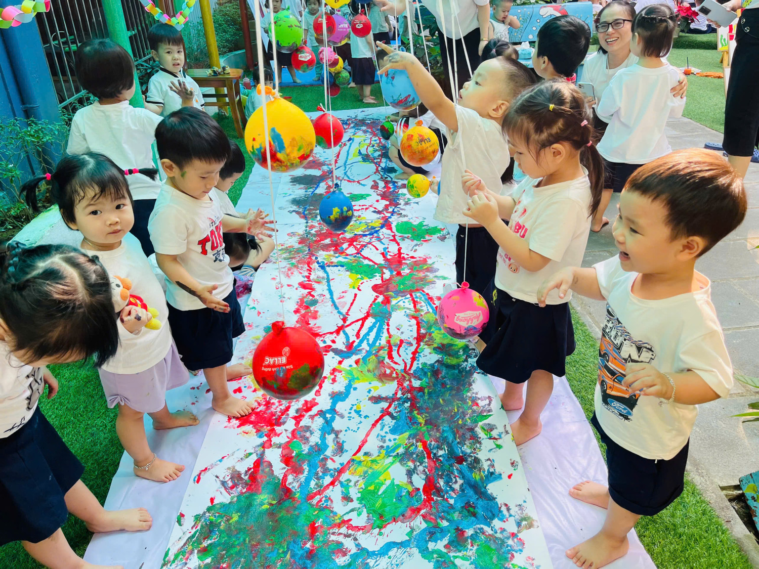 Các bé đã hào hứng tham gia nhiều hoạt động sáng tạo như: vẽ tranh trên nhiều nguyên vật liệu khác nhau (giấy, bìa gương, dù trong, nón, quạt, mẹt, đá cuội, lá…), in hình từ rau củ, bàn tay, vẽ, tô màu tranh khổ lớn, nhuộm vải, trang trí áo, vẽ khuôn mặt bạn… Mỗi hoạt động đều được tổ chức phù hợp với từng độ tuổi, đảm bảo an toàn và mang lại hiệu quả giáo dục thiết thực.